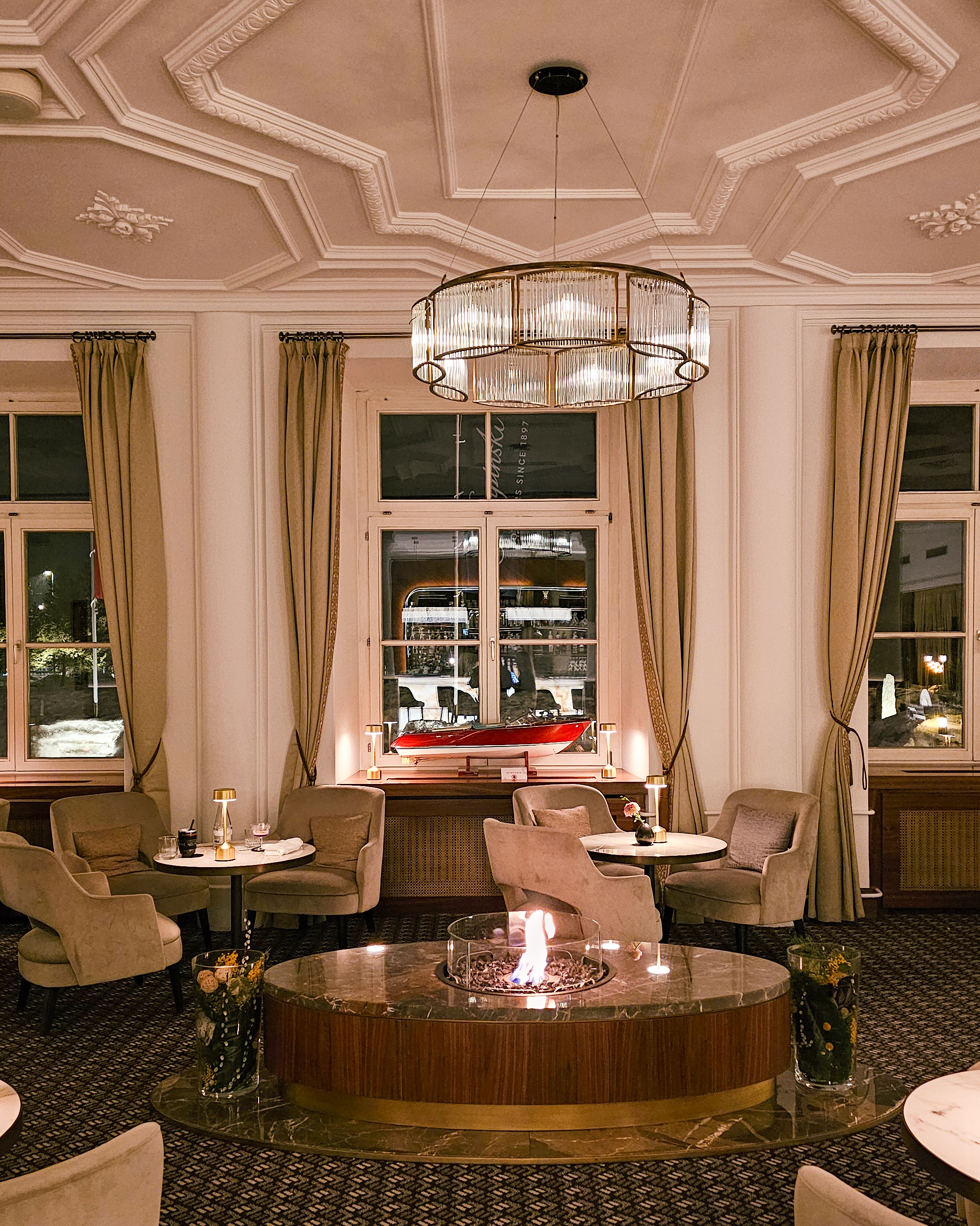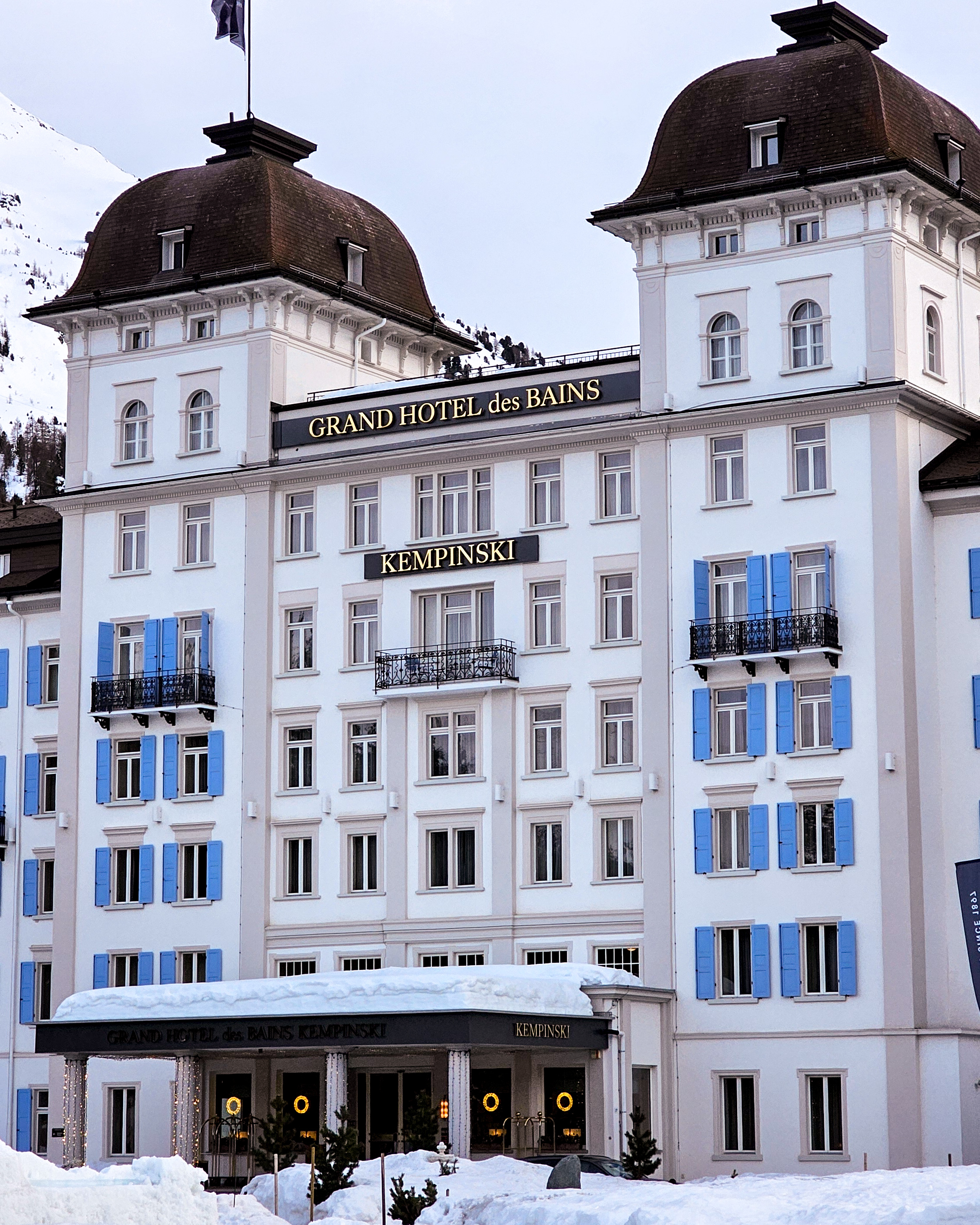 Questa volta la mia destinazione è il Grand Hotel des Bains Kempinski di St. Moritz, l’iconico hotel bianco e azzurro con le due torrette gemelle che dà il suo benvenuto all’ingresso del gaudente paesino svizzero.