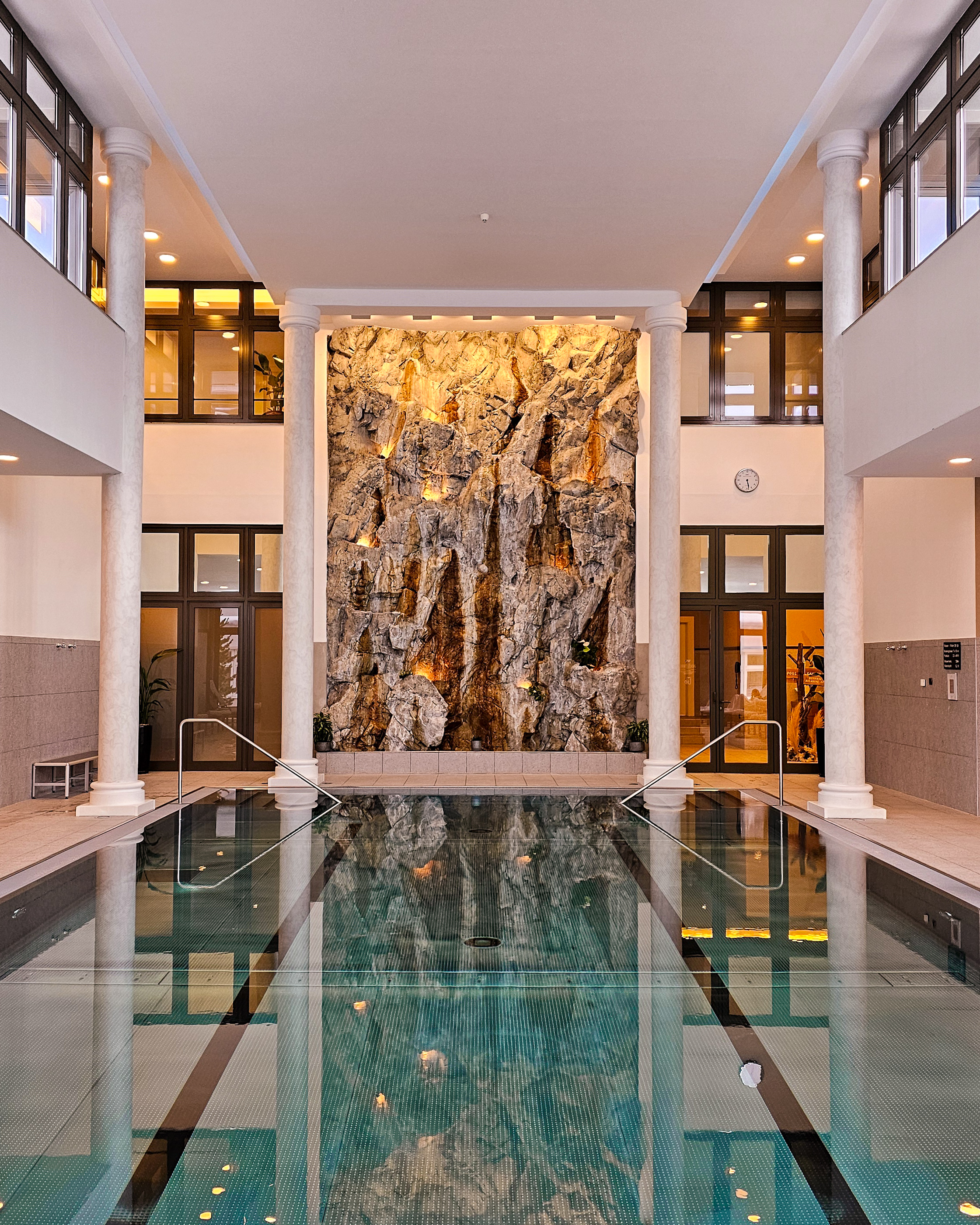 La SPA è davvero immensa: una piscina coperta con ampie vetrate ed eleganti colonne, una piscina esterna riscaldata circondata dalla neve, ben quattro tipi di sauna con diverse temperature e proprietà, hammam e laconium annesso, e infine diverse aree relax dove bere una tisana in assoluta pace.